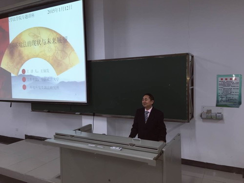 1月12日,2014-2015学年冬季小学期环境法专题课程在5号教学楼214教室正式开始。中国政法大学民商经济伟德victor1946网站环境资源法研究所所长王灿发教授就《中国环境法的现状和未来展望》为题,为2012级本科生带来了精彩的讲授。 王教授主要从我国环境法的发展进程、我国环境法面临的挑战和问题以及未来发展的展望几个方面深入浅出地为大家进行了分析与讲解,他将理论与实践相结合,剖析深刻,举例生动。王教授还适时引导同学们进行探讨研究,带动了同学们的学习积极性,整个课堂气氛活跃,同学们受益匪浅。