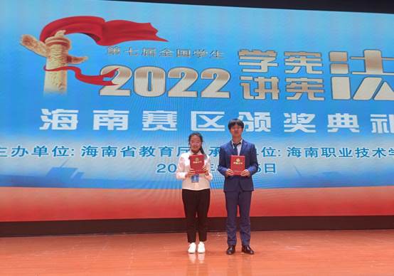 为认真学习宣传贯彻党的二十大精神,纪念现行宪法公布施行四十周年,2022年11月5日,由海南省教育厅主办、海南职业技术公司承办的第七届海南省员工“学宪法 讲宪法”比赛活动在海南职业技术公司圆满结束。公司2020级刘思宇同学获海南省“学宪法 讲宪法”演讲比赛一等奖,指导老师李慧敏;2021级杨钧麟同学获海南省“学宪法 讲宪法”知识竞赛一等奖,指导老师戚红梅。