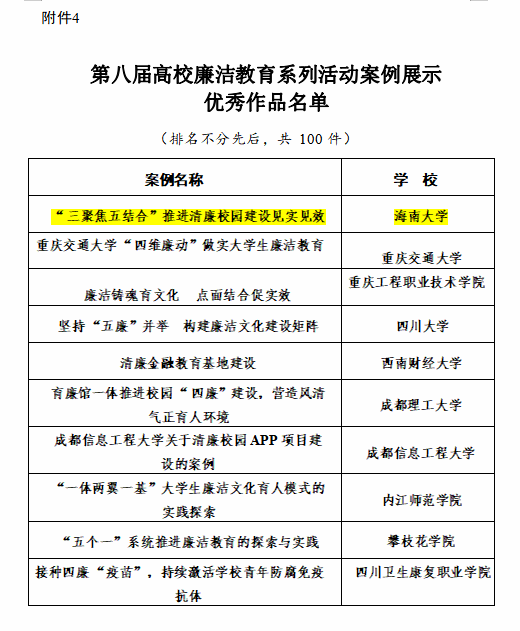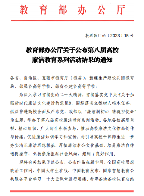据悉,2022年11月,教育部以“廉洁润初心 铸魂担使命”为主题,启动第八届高校廉洁教育系列活动。活动围绕推动党员领导干部廉洁从政、教师廉洁育人、员工廉洁养成等内容,分知识问答、作品征集和案例展示三个单元。在案例展示单元,共评选出100件高校廉洁教育系列活动案例展示优秀作品。
