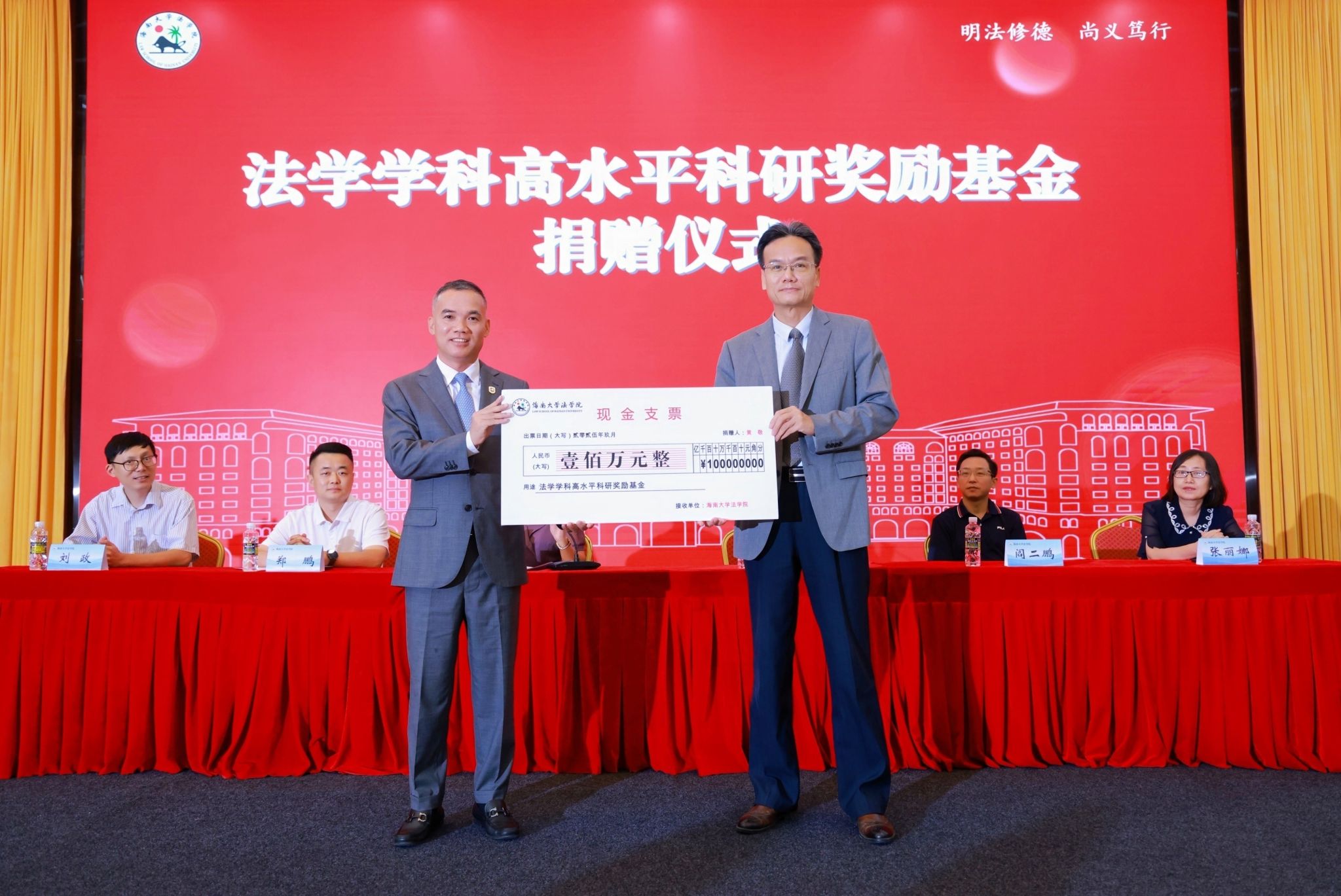 开学典礼现场还举行了法学学科高水平科研奖励基金捐赠仪式。黄敬向伟德victor1946网站捐赠人民币100万元,专项设立“法学学科高水平科研奖励基金”,激励公司师生勇攀科研高峰,产出更多标志性成果,助力一流法学团队建设。王琦代表公司接受捐赠支票,并向黄敬颁发捐赠证书。