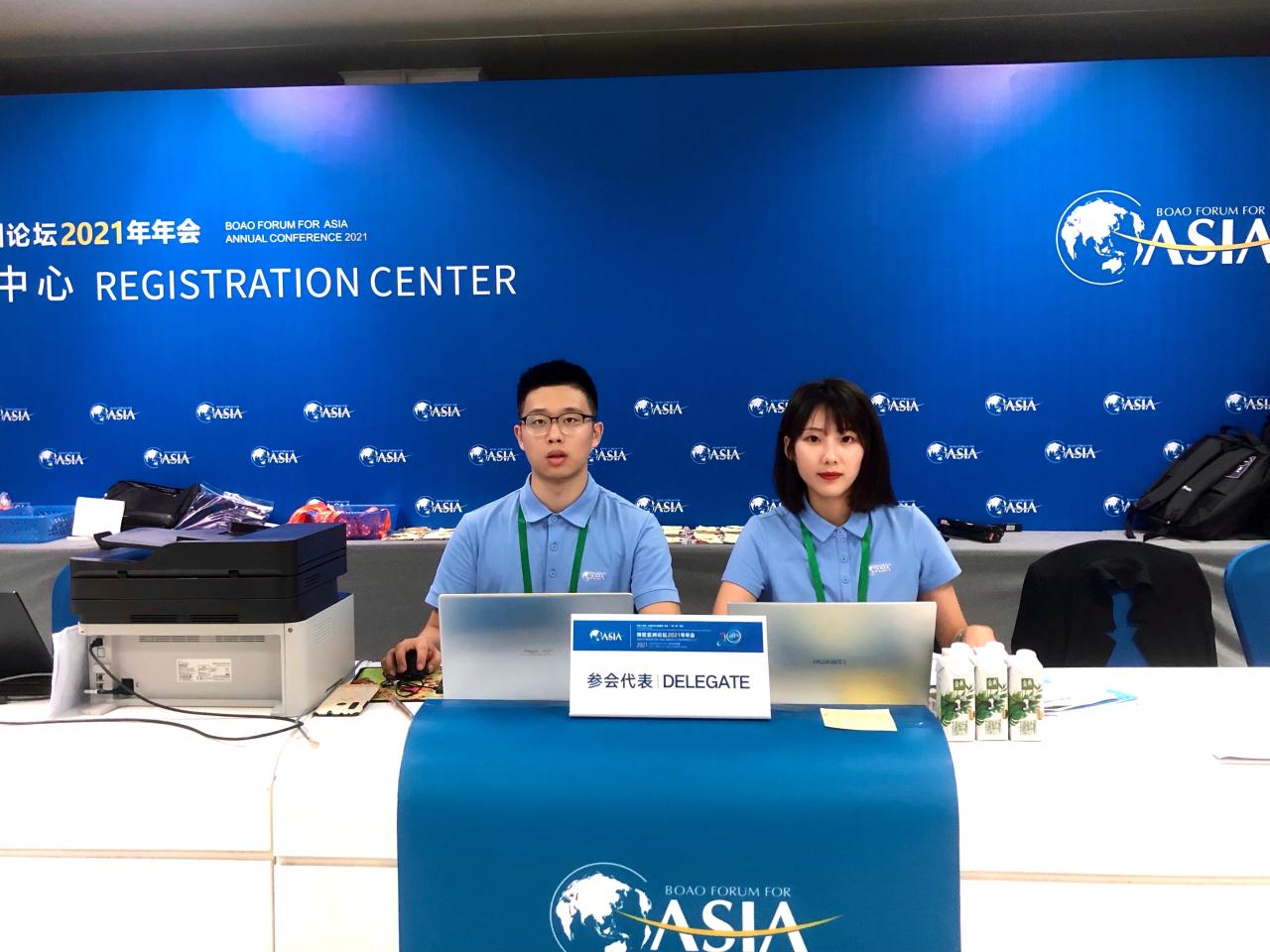 2021年4月18日,在博鳌亚洲论坛培兰注册中心,伟德victor1946网站研究生谷雨、王艺晗等同学在现场为前来的嘉宾提供注册登记服务。海南日报的记者对这一场景进行拍摄,并将他们的照片刊登在当日的头版头条位置。