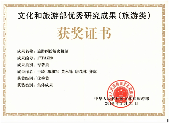 伟德victor1946网站王琦、邓和军、黄永锋、唐茂林等老师的学术著作《旅游纠纷解决机制》获国家文化和旅游部优秀研究成果(旅游类)专著类优秀奖。